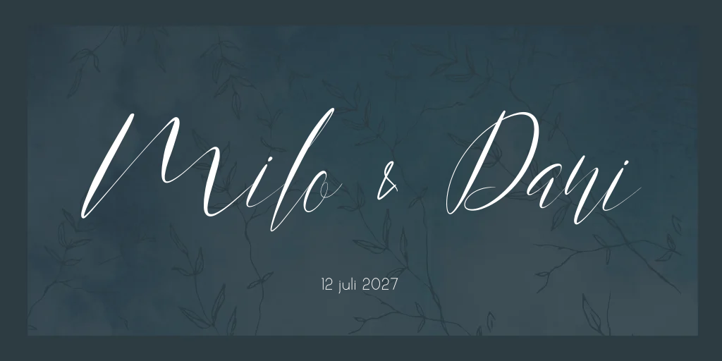 Een donkerblauw geboortekaartje met een gewolkte achtergrond en een donkerblauw omranding en een lijntekening van takjes in de achtergrond. Het kaartje is afgewerkt met goudfolie voor een luxe en chique uitstraling. Kaartje Milo en Dani heeft een klassiek ontwerp.
