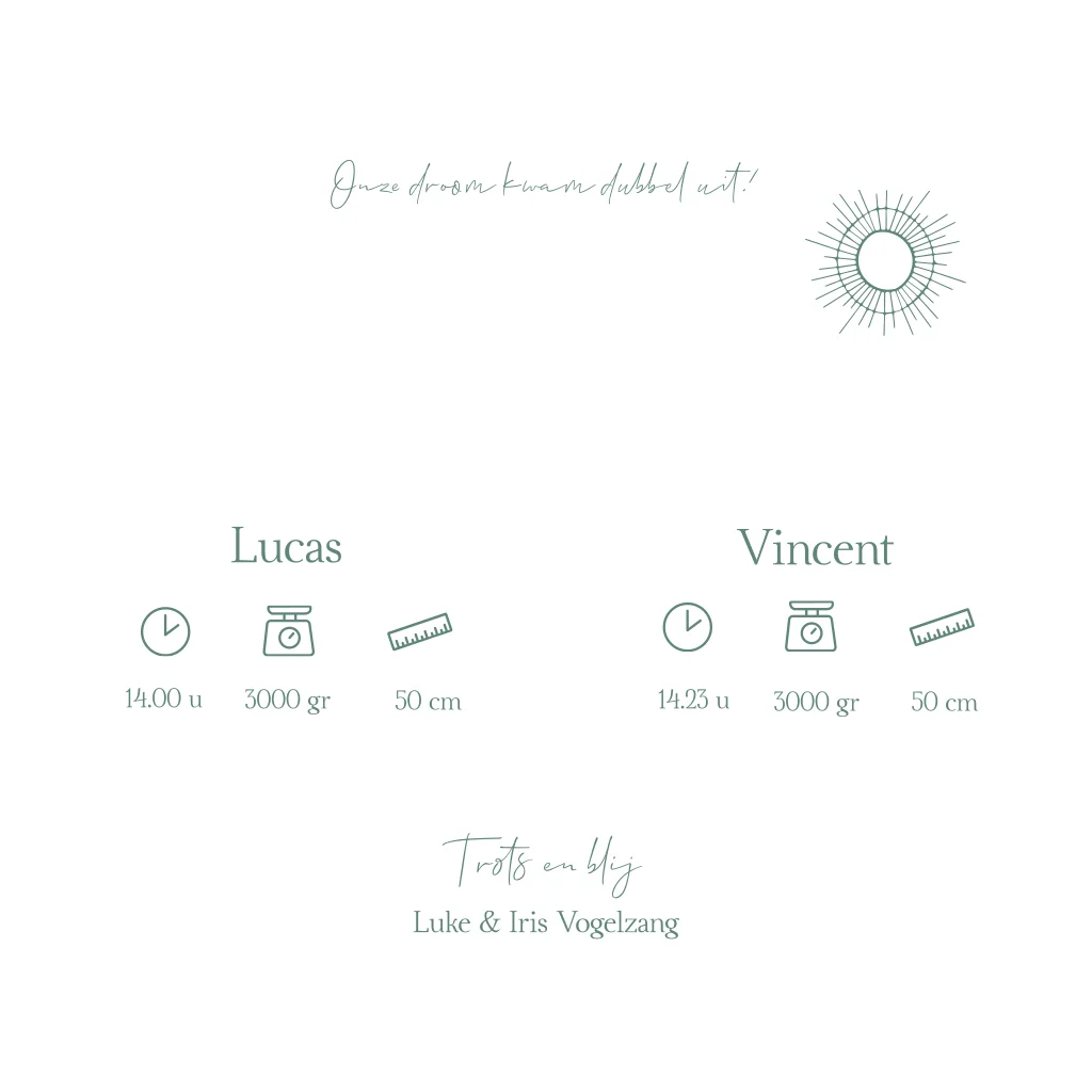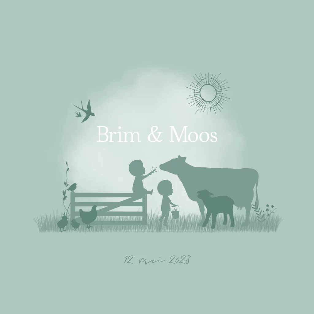 Een illustratieve tweelingkaart Brim & Moos in groene kleur, met een doorkijkje naar het boerderij leven. Een kleine tweeling/ 2 kleine jongetjes zijn buiten op de boerderij. Een broertje zit op een boeren hek in het weiland en voert de koe wat gras. Het andere broertje heeft een emmer vast met voer voor de dieren. Een lammetje kijkt toe en in het tafereel zijn ook een moeder kip en kuikens te zien, een vogeltje dat op het hekje zit en zwaluwen vogels die voorbij vliegen. De bloemetjes sieren het kaartje. Wil je het tafereel aanpassen naar jouw wensen? Voeg dan een paard toe of een kalfje, een hond of kat. Er is zoveel mogelijk! In de beeldbank vind je alle illustraties die je op de kaart kunt toevoegen. Heb je onze hulp nodig, laat het ons weten.