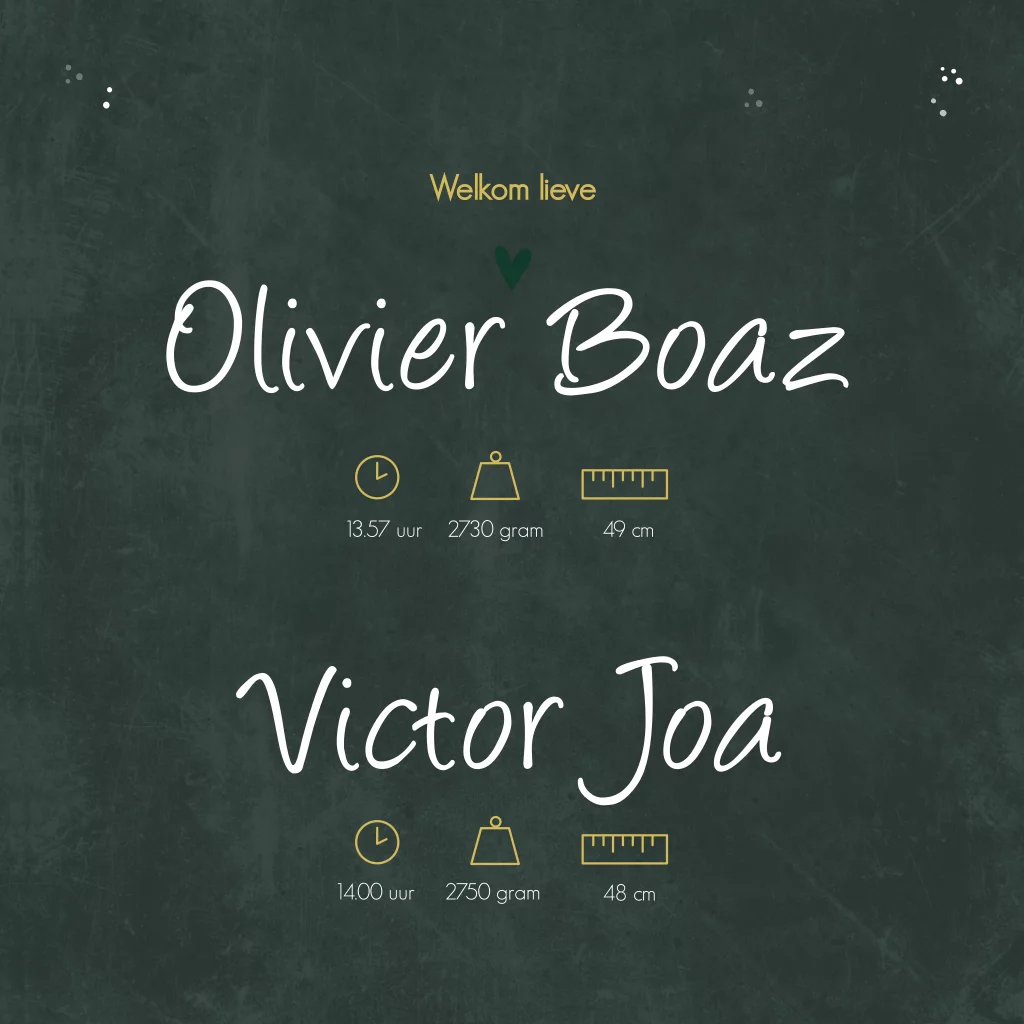 Stoer donkergroen kaartje voor een tweeling, met wereldbol en dieren. Geboortekaartje Olivier en Victor bevat een giraffe, edelhert, kangoeroe, ijsbeer, aapje, olifant en jaguar. Je kan naar eigen wens dieren vervangen in de editor. Wil je dit kaartje liever in een ander formaat? Kies hierboven het gewenste formaat.