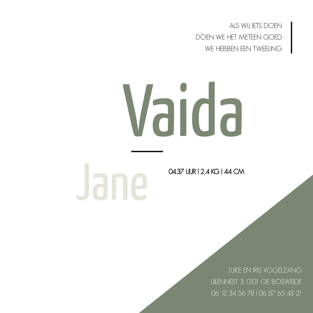 Een groen geboortekaartje met driehoeken en stipjes. Nard en Dain is een stoer kaartje voor een tweeling! Pas gemakkelijk de kleur aan in de editor. Kom je er niet uit? Neem dan gerust contact met ons op!
