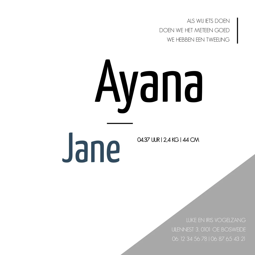 Een geboortekaartje met driehoeken en stipjes. Jorlan en Ayana is een stoer kaartje voor een tweeling! Bekijk de verschillende opties in de editor. Kom je er niet uit? Neem dan gerust contact met ons op!