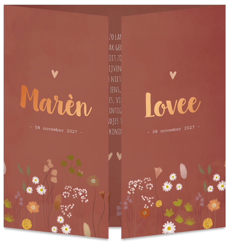 Een warm roestrood geboortekaartje met een getekend bloemenveld met droogbloemen. De namen staan in koperfolie wat ervoor zorgt dat ze extra goed opvallen. Kaartje Marèn en Lovee is een luikkaartje. Dit betekent dat het kaartje vanuit het midden opengaat. Zo heeft ieder kindje haar eigen zijde van de kaart. Maar als je het kaartje weer dichtklapt zijn ze weer samen één geheel.
