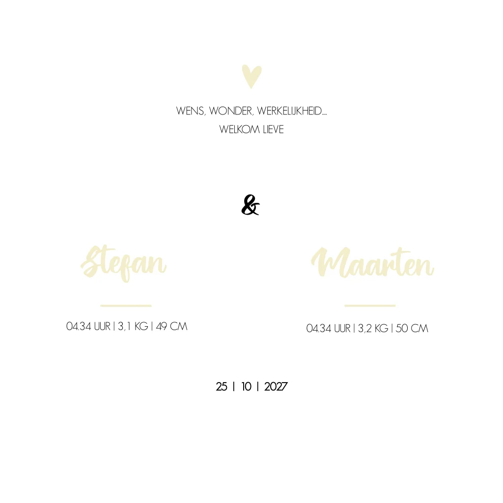 Een lief geboortekaartje voor een tweeling met veel creme/ beige hartjes en de babynamen in goudfolie. Geboortekaartje Vesper en Rube is een stoer kaartje voor een tweeling! Met goud- of koperfolie is deze kaart ook erg mooi. Je bewerkt hem zelf in onze editor!