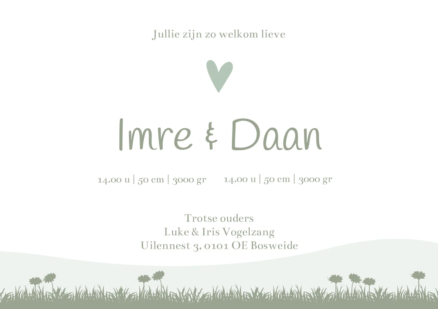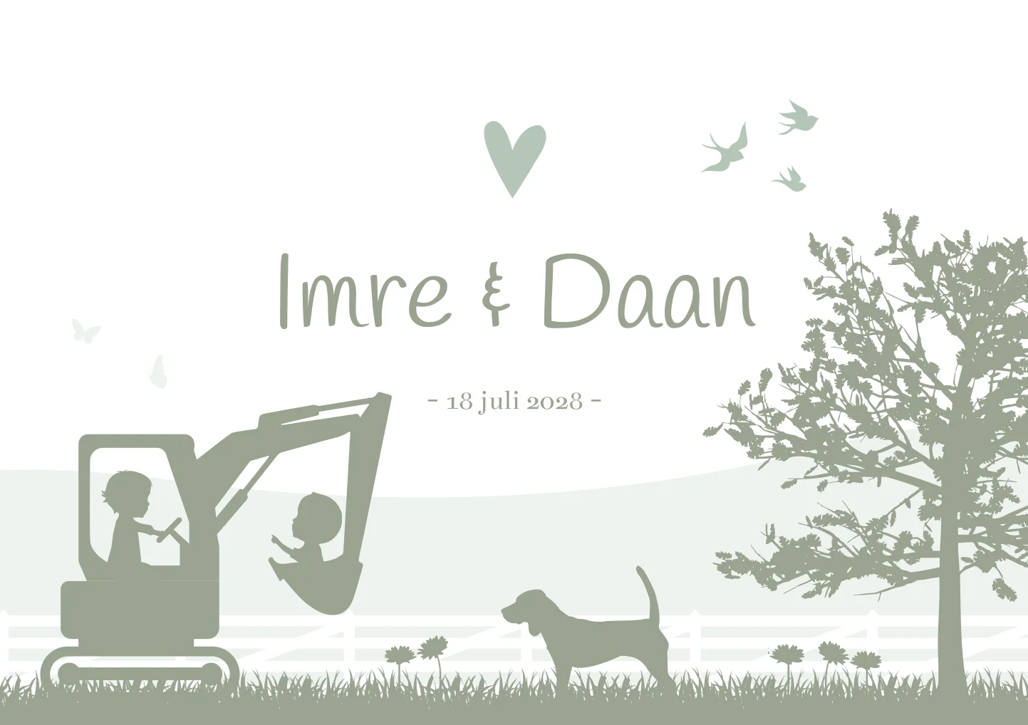 Een vrolijk en lief illustratie geboortekaartje. Op kaartje Imre & Daan zie je 2 broers die buiten aan het spelen zijn op de graafmachine. De hond, hun beagle kijkt toe. Verder staan ze in een natuurlijke omgeving omringd door diertjes zoals vlindertjes, vogeltjes en konijntjes. Wil je graag iets aanpassen? Neem dan een kijkje in onze editor voor alle opties!