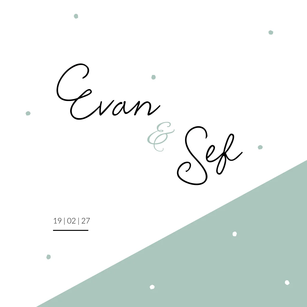 Door de stipjes krijgt het tweeling kaartje Evan en Sef een speelse uitstraling. Door gebruik te maken van een handgeschreven lettertype is er een perfecte balans tussen lief en modern!