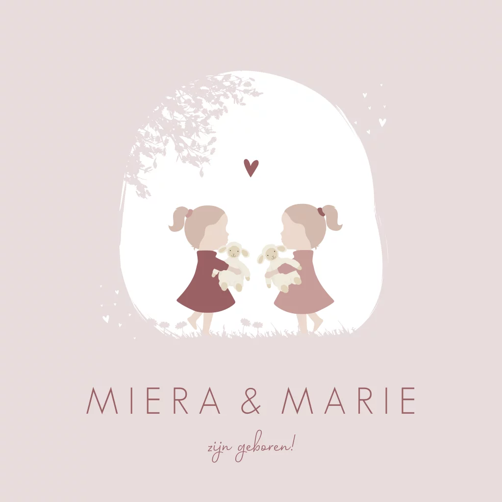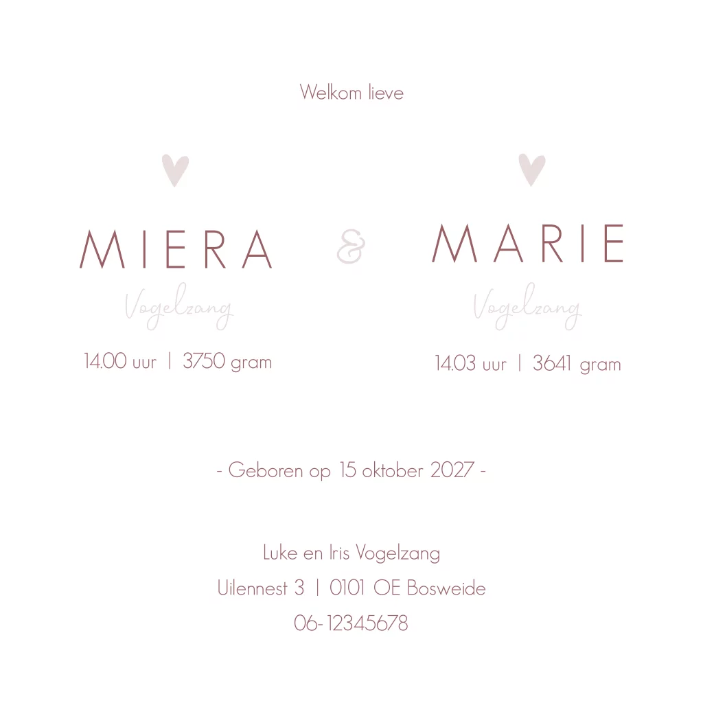 Het Uilennestje x Happy Horse. Een lief roze geïllustreerd geboortekaartje van tweelingzusjes met als toevoeging een Happy Horse knuffels. Wil je graag iets aanpassen aan kaartje Miera en Marie? Neem dan een kijkje in onze beeldbank voor alle opties. Mis je nog iets? Neem dan contact met ons op en we helpen je graag verder!