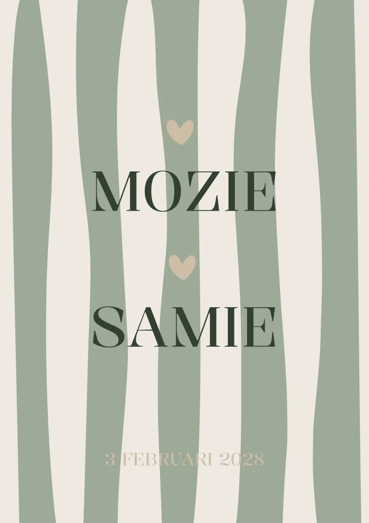 Een prachtig beige en groen gestreept geboortekaartje Mozie & Samie met een hartje.