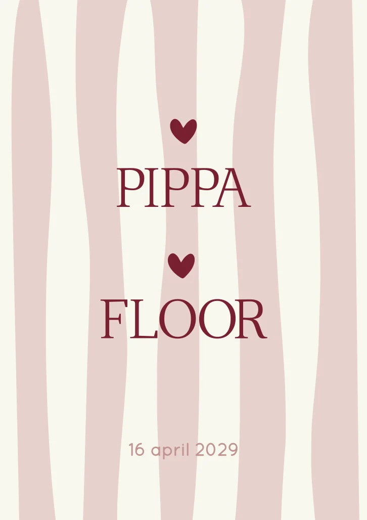 Een prachtig beige en roze/aubergine/paars gestreept geboortekaartje Pippa & Floor met hartjes.