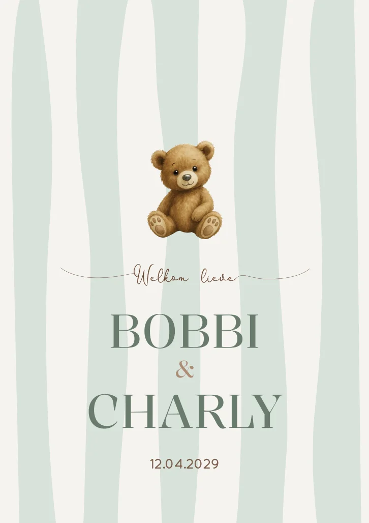 Een prachtig beige en bruin gestreept geboortekaartje Bobbi & Charly met een schattig illustratief watercolor teddybeertje.