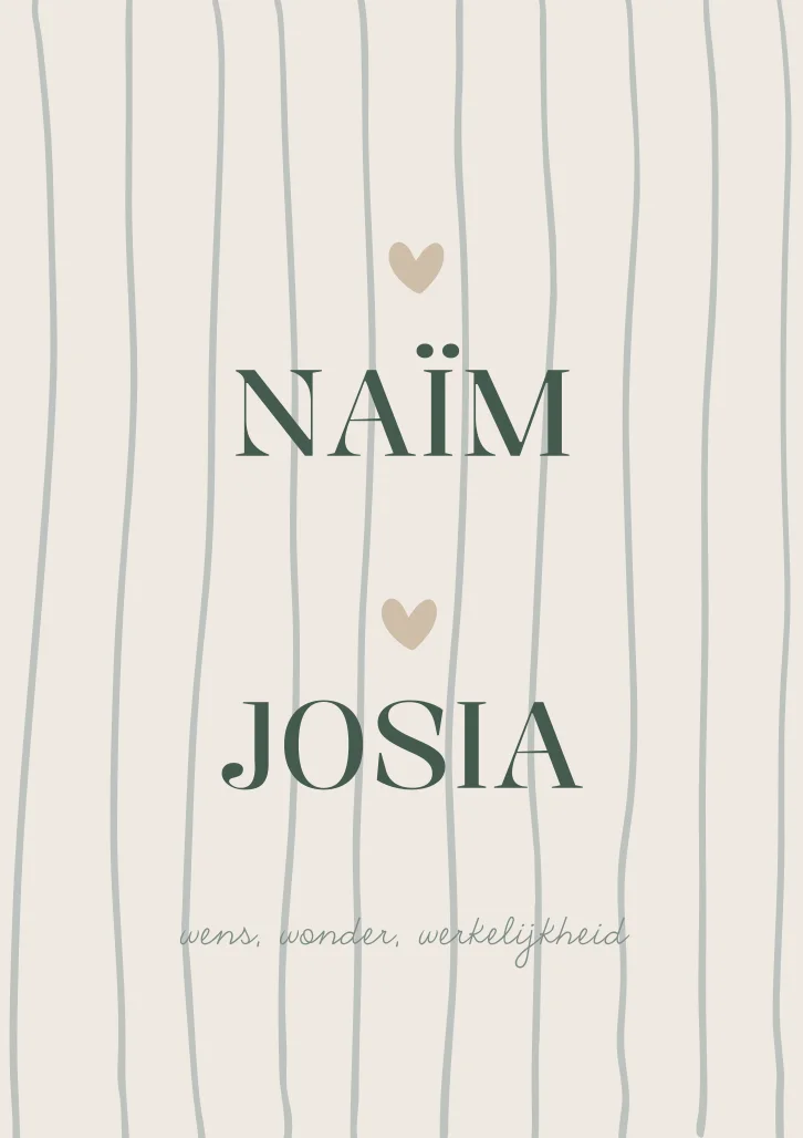 Een prachtig zacht groen met donkergroen gestreept baby kaartje Naïm & Josia met een hartje.