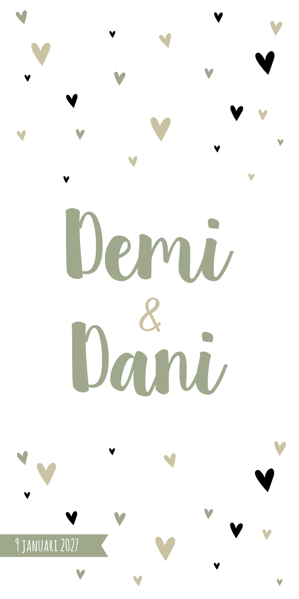 Een mooi geboortekaartje met hartjes voor een tweeling. Door de combi van de kleuren zwart, beige en grijsgroen is het een mooie keuze als je een jongen en meisje krijgt. Kaartje Demi en Dani kun je helemaal naar wens aanpassen in onze editor!