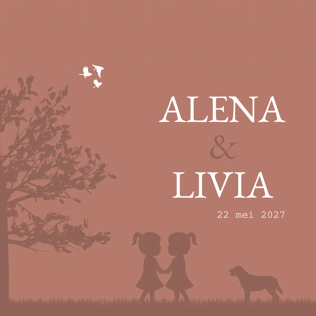 Een lief oudroze geboortekaartje voor tweelingmeisjes met gouden letters. Kaartje Alena en Livia is volledig aan te passen naar jouw gezinssituatie zodat zelfs jullie huisdieren een plekje op het kaartje krijgen. Mis je een soort ras? Neem dan contact met ons op voor de mogelijkheden.