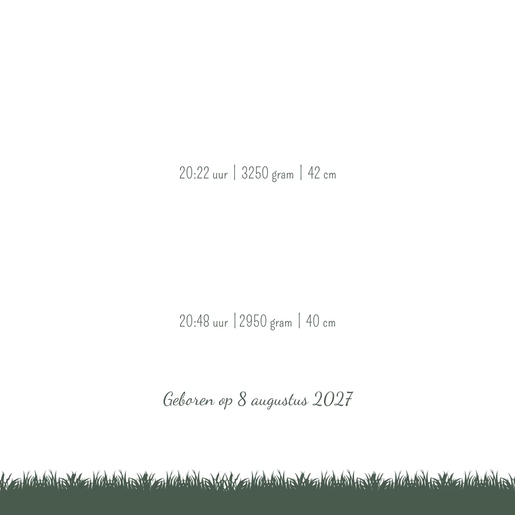 Een groengrijs geboortekaartje met twee jongetjes die hun hond uitlaten. Geboortekaartje Ferre & Nanne is een illustratie kaartje waarbij je de illustraties eenvoudig zelf kunt aanpassen in de editor. Zo kan je bijvoorbeeld extra dieren toevoegen of de hond vervangen voor een ander dier. Kom je er zelf niet uit? Neem gerust contact met ons op, we helpen je graag.