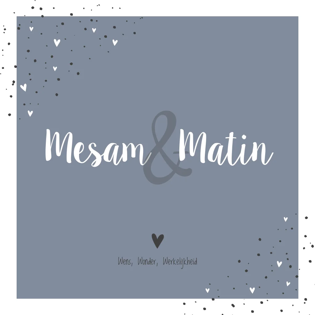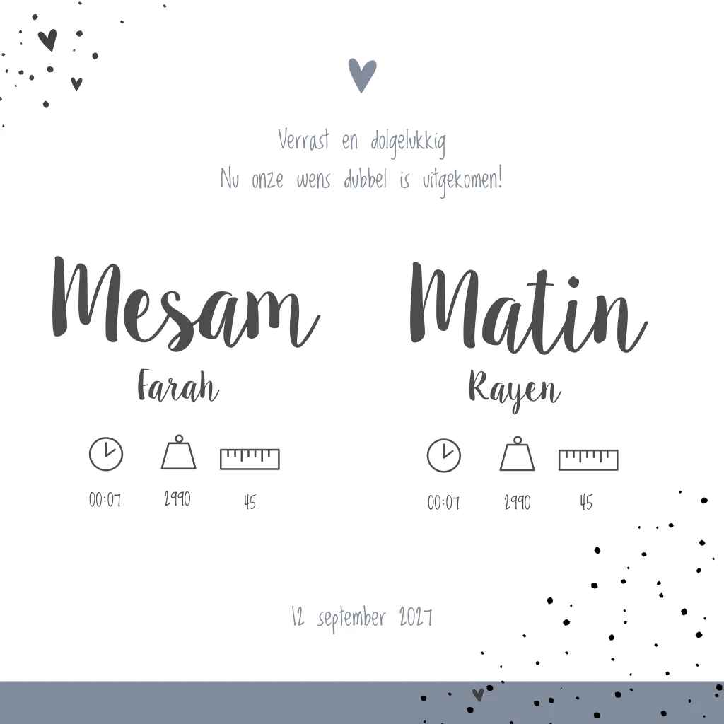 Een blauw geboortekaartje voor een tweeling met wit kader met in de hoeken stipjes en hartjes. Mesam & Matin is een stoer kaartje. Pas gemakkelijk de kleuren aan in de editor.