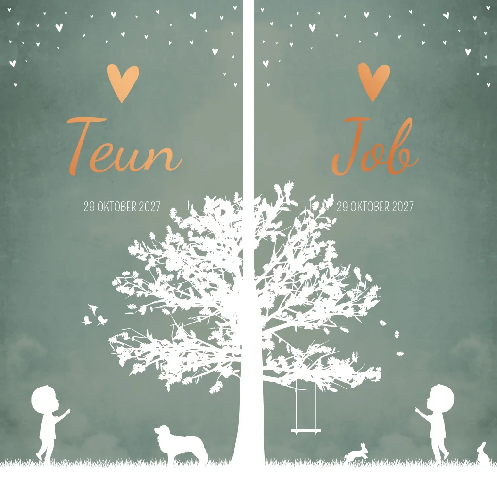 Twee losse geboortekaartjes die samen 1 geheel vormen. Zo heeft ieder kindje zijn eigen kaartje. Op kaartje Teun en Job zijn twee jongetjes afgebeeld die wijzen naar elkaar. De boom in het midden komt samen wanneer je de kaartjes naast elkaar legt. De jongens zijn omringd door verschillende diertjes en de koperfolie maakt het helemaal af.