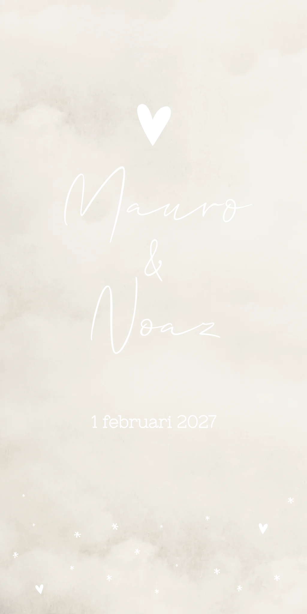 Een neutraal geboortekaartje met een gewolkte achtergrond. Kaartje Mauro en Noaz is een lief geboortekaartje en wordt nog mooier als je het kaartje laat drukken met koperfolie.