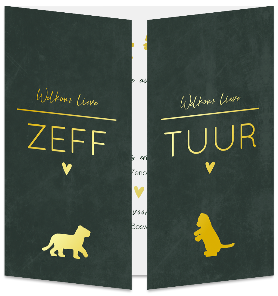 Een stoer groen geboortekaartje met twee spelende leeuwtjes. Door de combinatie tussen een strak en speels lettertype is het een bijzonder ontwerp. Kaartje Zeff en Tuur is een luikkaartje. Dit betekent dat het kaartje vanuit het midden opengaat. Zo heeft ieder kindje zijn eigen zijde van de kaart. Maar als je het kaartje weer dichtklapt zijn ze weer samen één geheel.
