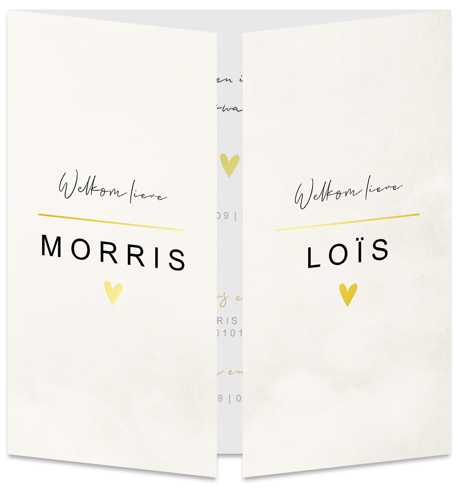 Een neutraal en strak beige geboortekaartje voor een tweeling. Door de kleur is het kaartje genderneutraal, dus geschikt voor zowel een jongen als meisje. Kaartje Morris en Loïs is een luikkaartje. Dit betekent dat het kaartje vanuit het midden opengaat. Zo heeft ieder kindje zijn eigen zijde van de kaart. Maar als je het kaartje weer dichtklapt zijn ze weer samen één geheel.