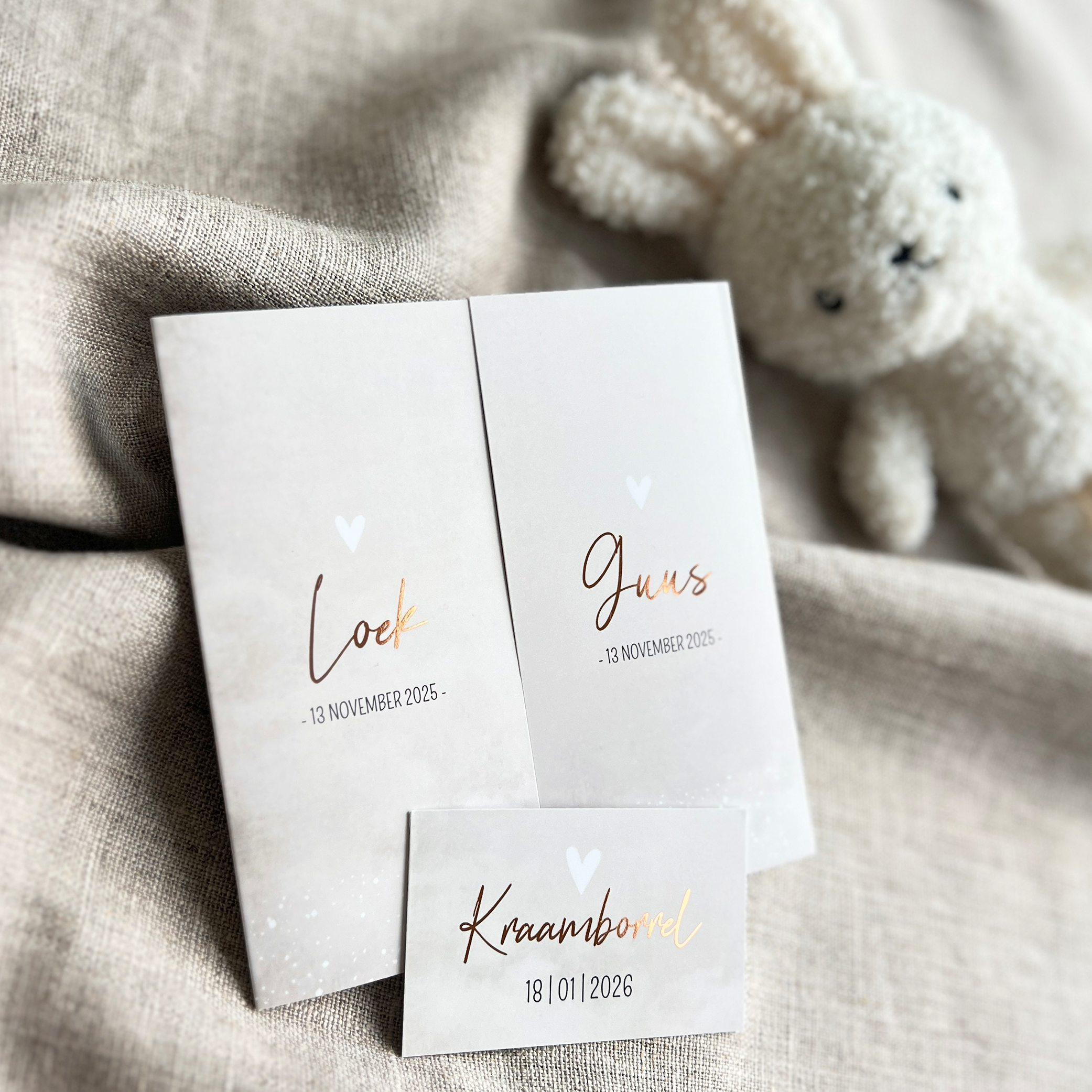 Een beige gewolkt geboortekaartje met witte stipjes. De namen op de kaart zijn met koperfolie afgewerkt voor het chique effect. Kaartje Jackie en Charlie is een luikkaartje. Dit betekent dat het kaartje vanuit het midden opengaat. Zo heeft ieder kindje haar eigen zijde van de kaart. Maar als je het kaartje weer dichtklapt zijn ze weer samen één geheel.