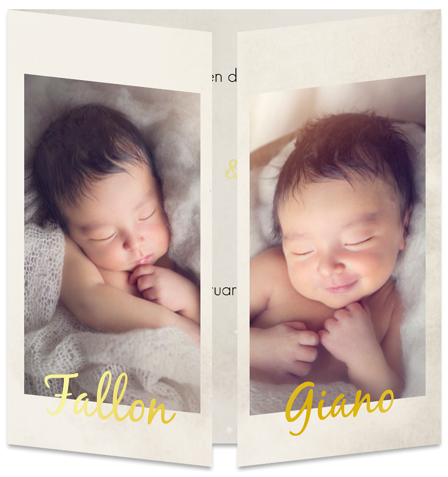 Een prachtig luikkaartje voor een tweeling. Op de voorzijde is voor ieder kindje een plek voor zijn/haar foto. Doordat de naam in goudfolie er iets overheen valt krijg je een mooi effect. Kaartje Fallon en Giano is een luikkaartje. Dit betekent dat het kaartje vanuit het midden opengaat. Zo heeft ieder kindje zijn eigen zijde van de kaart. Maar als je het kaartje weer dichtklapt zijn ze weer samen één geheel.