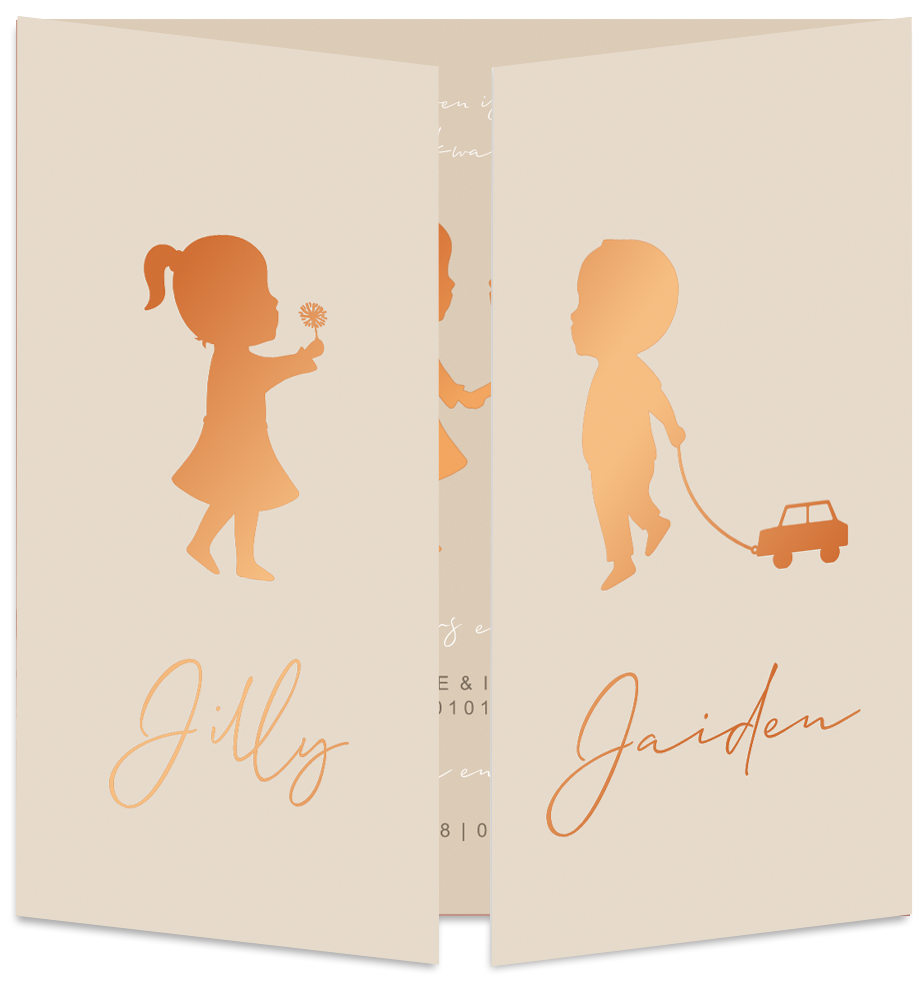 Een neutraal en strak beige geboortekaartje voor een tweeling. Door de kleur is het kaartje genderneutraal, dus geschikt voor zowel een jongen als meisje. Op het kaartje staat een silhouet illustratie van 2 kindjes die elkaars handen vasthouden en op de voorzijde staat het meisje met een paardenbloem en het jongetje met een auto. Kaartje Jilly en Jaiden is een luikkaartje. Dit betekent dat het kaartje vanuit het midden opengaat. Zo heeft ieder kindje zijn eigen zijde van de kaart. Maar als je het kaartje weer dichtklapt zijn ze weer samen één geheel.