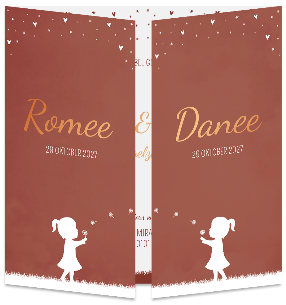Een roestrood gewolkt geboortekaartje met een silhouet illustratie van twee meisjes die paardenbloem pluisjes naar elkaar blazen. Kaartje Romee en Danee is een luikkaartje. Dit betekent dat het kaartje vanuit het midden opengaat. Zo heeft ieder kindje haar eigen zijde van de kaart. Maar als je het kaartje weer dichtklapt zijn ze weer samen één geheel.