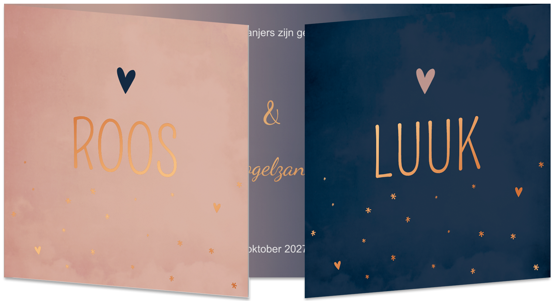 Een gewolkt oudroze geboortekaartje wat overloopt in donkerblauw en is afgewerkt met koperfolie letters en hartjes/sterretjes. Kaartje Roos en Luuk is een luikkaartje. Dit betekent dat het kaartje vanuit het midden opengaat. Zo heeft ieder kindje zijn eigen zijde van de kaart. Maar als je het kaartje weer dichtklapt zijn ze weer samen één geheel.