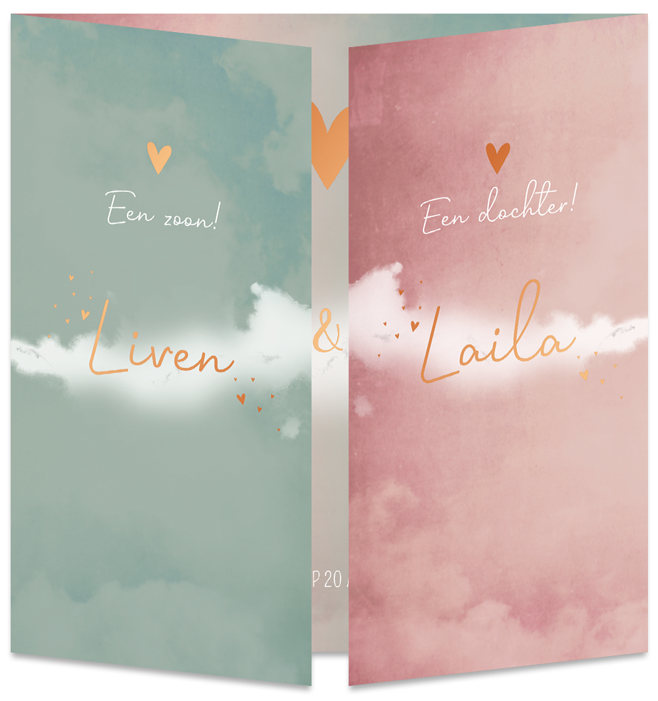 Een roze en groen geboortekaartje met een gewolkt effect. Op kaartje Laila en Liven staan verschillende hartjes in koperfolie, dat maakt het kaartje extra romantisch. Kaartje Laila en Liven is een luikkaartje. Dit betekent dat het kaartje vanuit het midden opengaat. Zo heeft ieder kindje haar eigen zijde van de kaart. Maar als je het kaartje weer dichtklapt zijn ze weer samen één geheel.