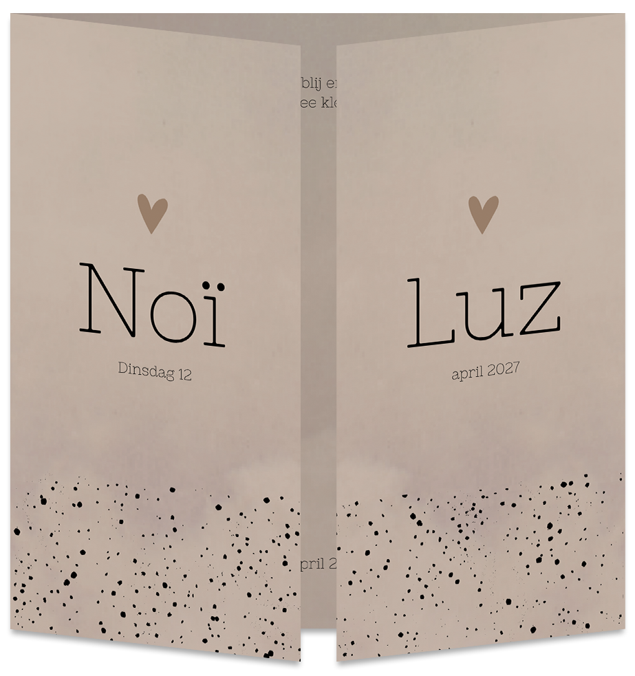 Een taupe bruin gewolkt geboortekaartje met stipjes, hartjes en zwarte letters. Kaartje Noï en Luz is een stoer en neutraal luikkaartje. Dit betekent dat het kaartje vanuit het midden opengaat. Zo heeft ieder kindje haar eigen zijde van de kaart. Maar als je het kaartje weer dichtklapt zijn ze weer samen één geheel.