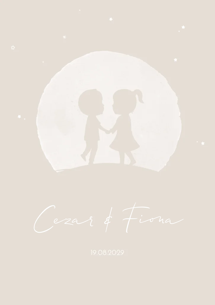 Een zacht beige neutraal geboortekaartje met een witte maan. Op kaartje Cezar & Fiona is een silhouet van een jongen en een meisje te zien. Ziet jouw gezin er anders uit? In onze beeldbank kun je veel meer soorten lijntekeningen vinden.