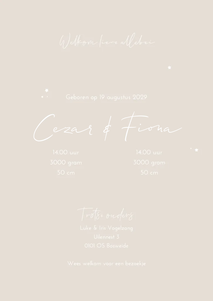 Geboortekaartje Tweeling Maan Lijntekening Sterretjes