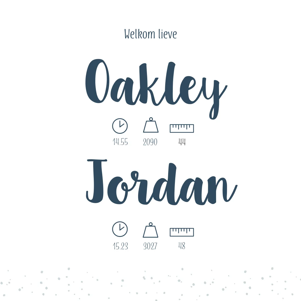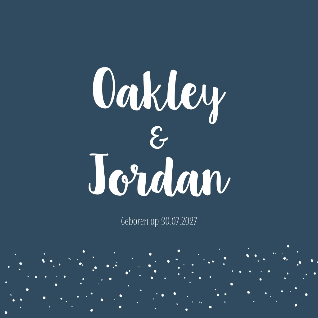 Geboortekaartje in oud blauwe kleur met witte letters. De subtiele stipjes op geboortekaartje Oakley & Jordan maken het kaartje helemaal af.