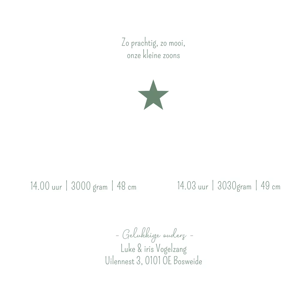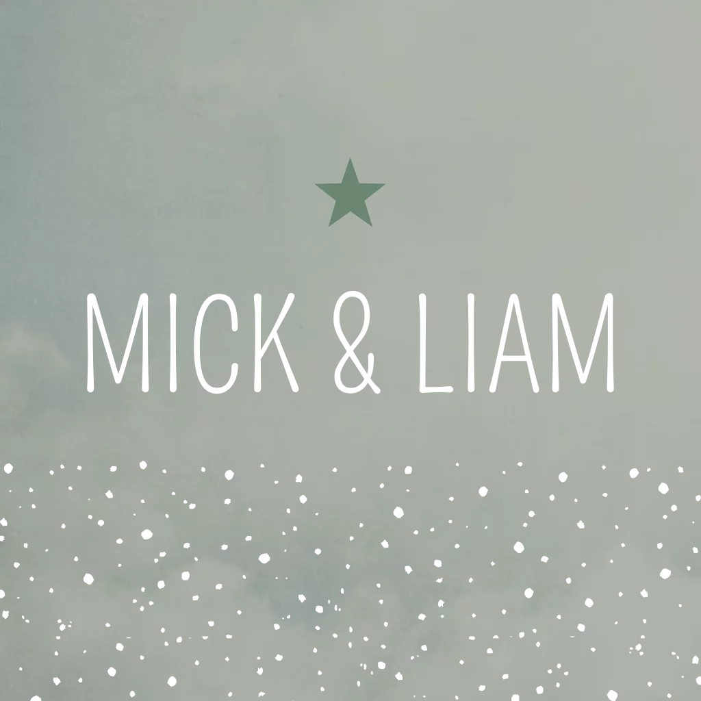 Oudgroen gewolkt geboortekaartje voor een tweeling, met stipjes en sterretjes. Geboortekaartje Mick en Liam wordt extra mooi wanneer je het laat bedrukken met koperfolie. Pas het kaartje naar eigen smaak aan in de editor.