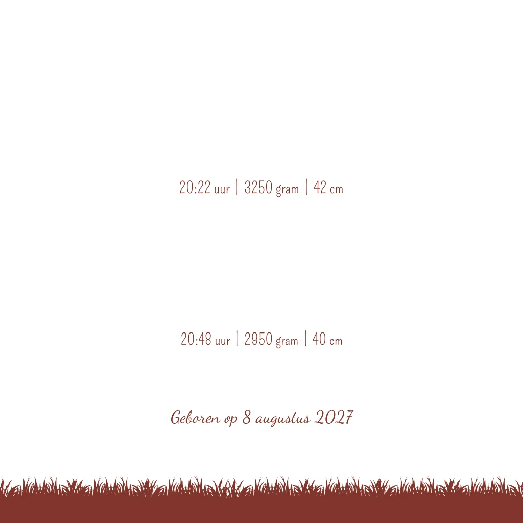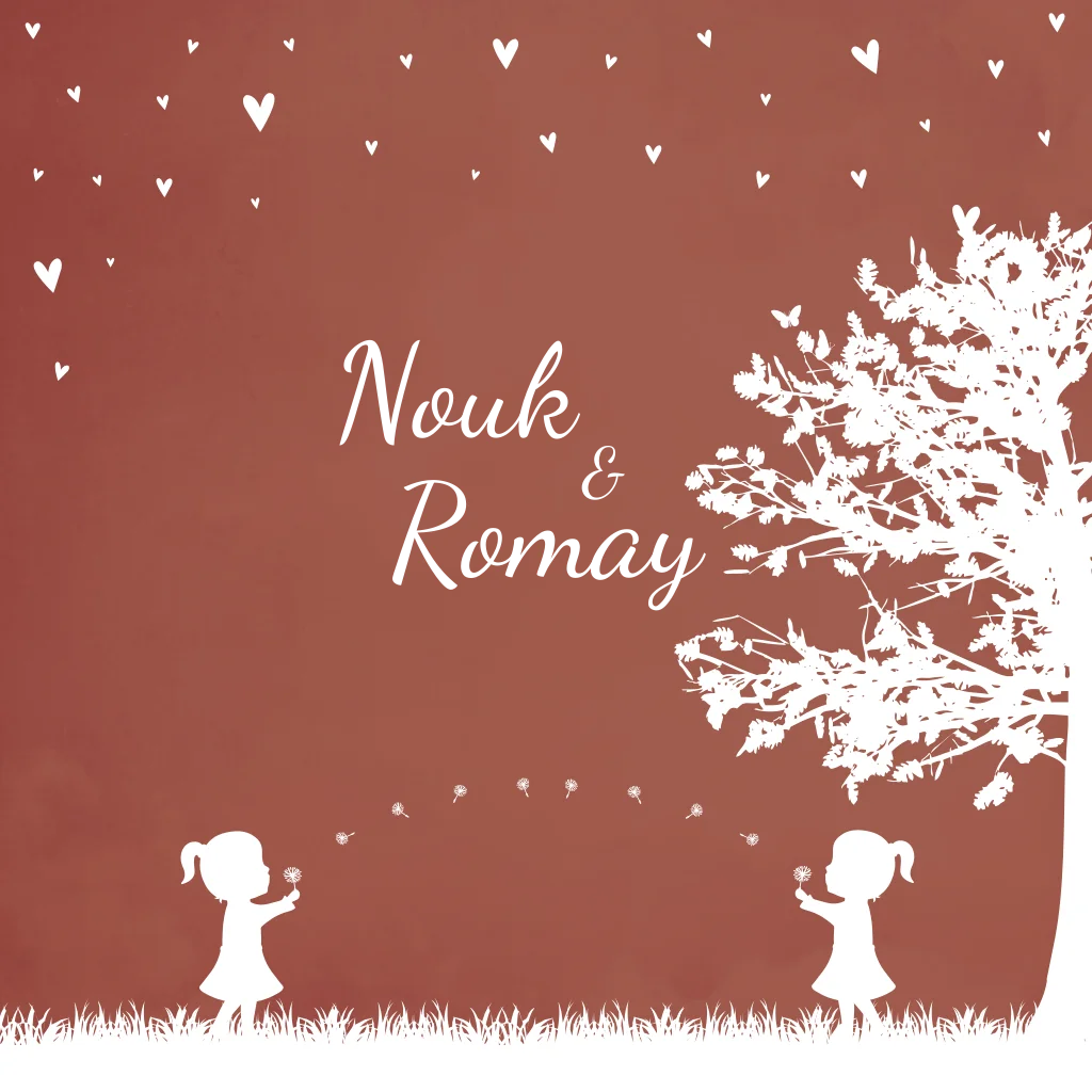 Een roestbruin bordeaux rood geboortekaartje met twee meisjes die paardenbloemen naar elkaar blazen. Naast de tweeling staat een boom. Geboortekaartje Nouk & Romay is een illustratie kaartje waarbij je de illustraties eenvoudig zelf kunt aanpassen in de editor. Zo kan je bijvoorbeeld je huisdieren of eventuele oudere kindjes toevoegen. Kom je er zelf niet uit? Neem gerust contact met ons op, we helpen je graag.