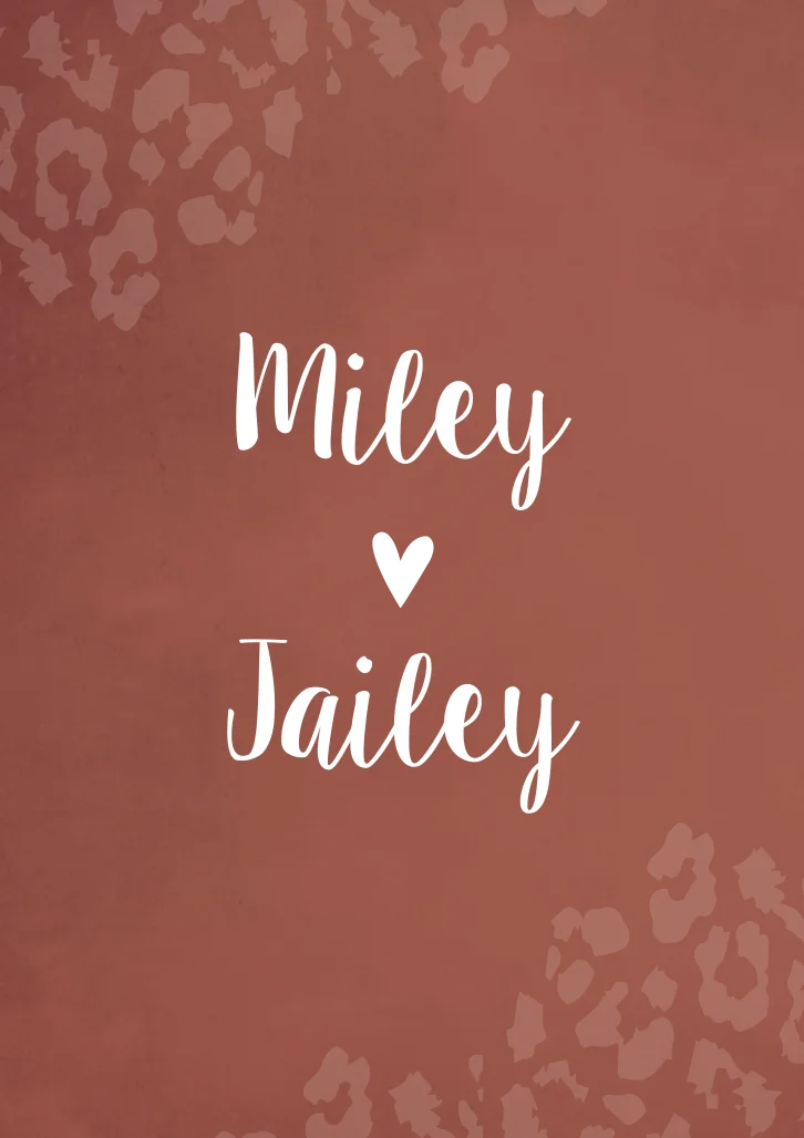 Een stoer geboortekaartje voor een tweeling met een prachtig warme roestbruine tint. In de hoeken is een panter patroon geplaatst en om het kaartje wat romantischer te maken staan er enkele hartjes op het kaartje. Kaartje Miley en Jailey is prachtig in combinatie met koperfolie.