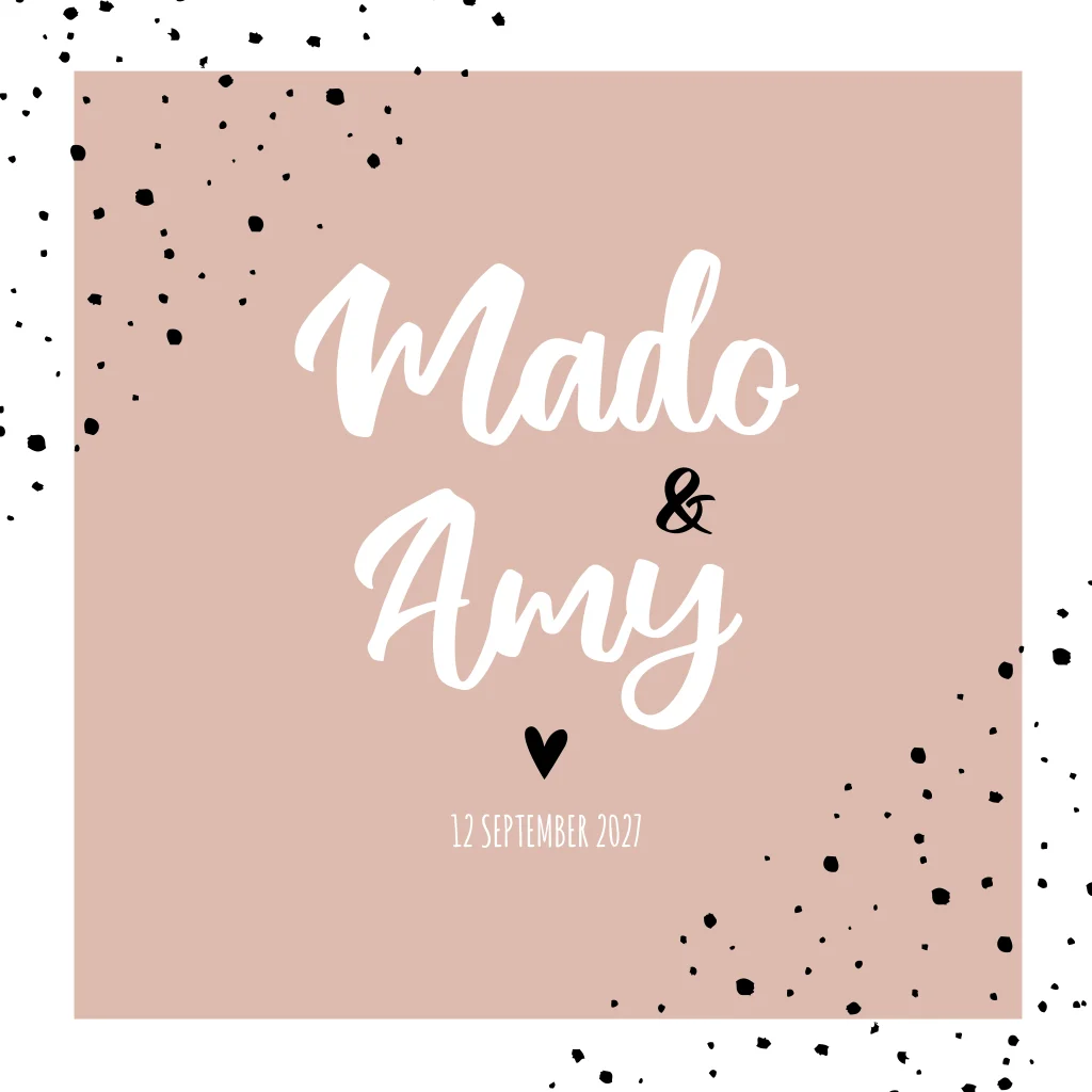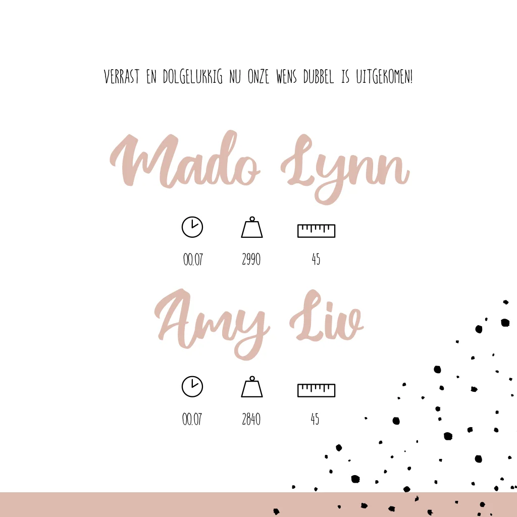 Een spetterend roze geboortekaartje. Kaartje Mado en Amy is een tweeling geboortekaartje vol zwarte stipjes! Bekijk de verschillende opties in de editor.