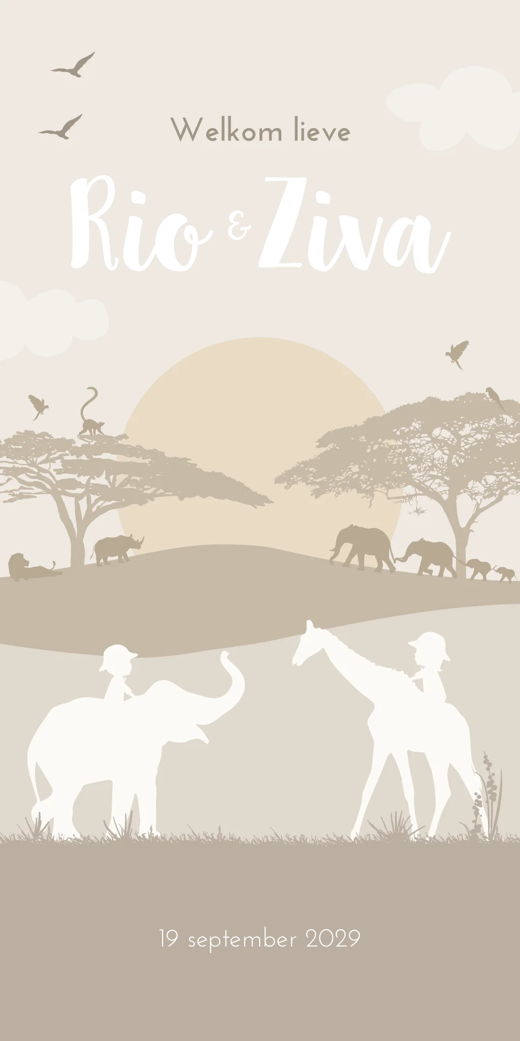 Een avontuurlijk geboortekaartje voor de wereldreizigers die graag de wereld ontdekken en op avontuur gaan. Het kaartje Rio& Ziva voor een tweeling bevat baobab bomen, olifanten, giraffen aapjes, leeuw, papegaaien en vogels. Dit tafereel speelt zich af in een Afrikaans landschap met een romantisch ondergaande zon. De broer en zus zijn samen heerlijk aan het spelen in de buitenlucht en rijden op een olifantje en giraffe. Deze kaart is extra mooi met goudfolie, maar het kan ook mooi zonder foliedruk of een andere kleur folie. Je past de beige/ neutrale lichte kleuren eenvoudig aan in onze online editor.