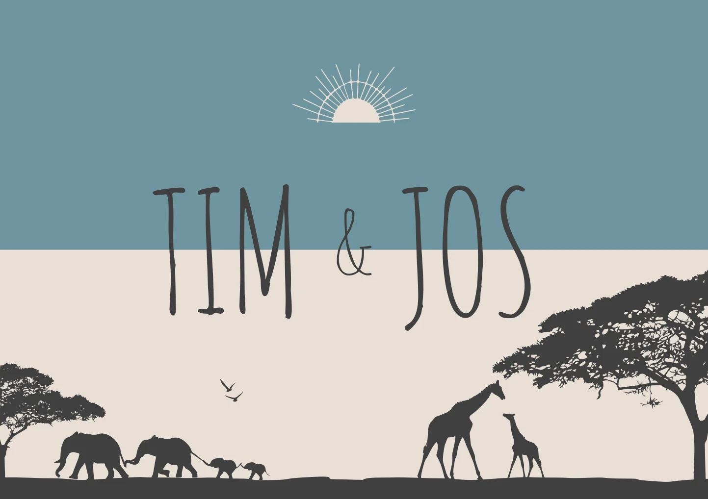Een speels geboortekaartje met safari dieren. Kaartje Tim en Jos is een beige en blauw geboortekaartje met vrolijke illustraties van de opkomende/ondergaande zon en verschillende dieren, waaronder olifanten, giraffes en vogels. Een perfect kaartje voor alle liefhebbers van reizen en avontuur!