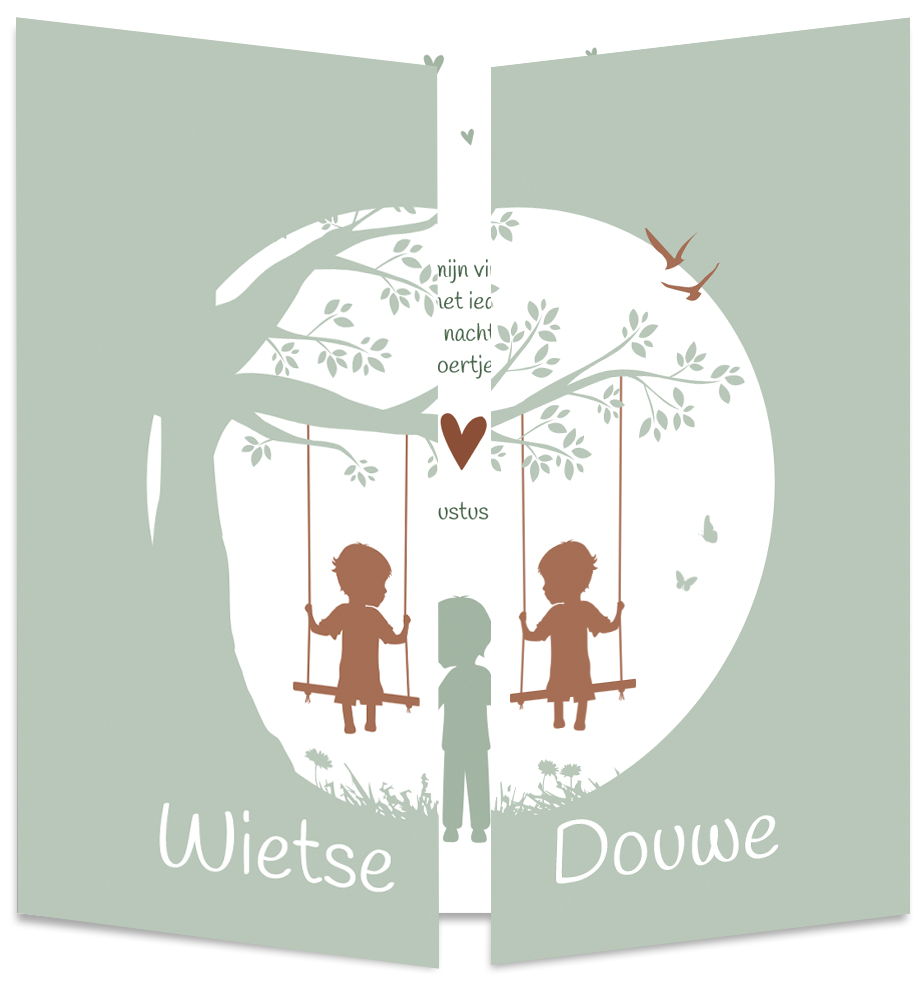 Een early dew groen geboortekaartje met een doorkijkje in een tuin waar tweelingbroertjes heerlijk aan het schommelen zijn in een boom. Ze worden omringt door vogels, bloemetjes en vlinders. Aan de binnenzijde van de kaart is ruimte voor een mooie tekst en daar zijn bruin kleurige hartjes te zien. Kaartje Wietse en Douwe is een luikkaartje. Dit betekent dat het kaartje vanuit het midden opengaat. Zo heeft ieder kindje zijn eigen zijde van de kaart. Maar als je het kaartje weer dichtklapt zijn ze weer samen één geheel.