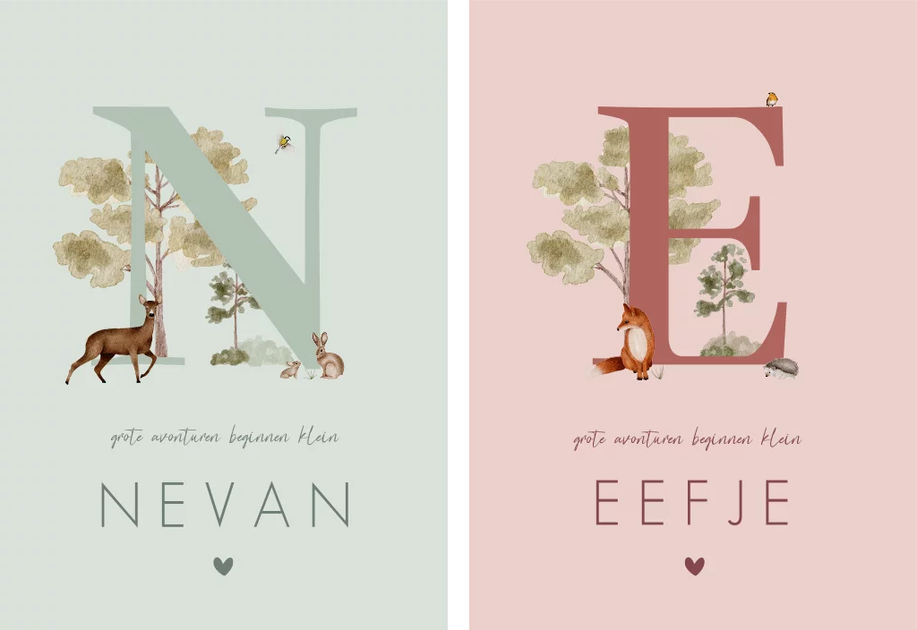 Lieve geboortekaartjes met een groot initiaal op de voorkant die wordt omringd door verschillende bosdieren in waterverf stijl. Voor het meisjeskaartje is de achtergrond lichtroze/pastelroze en voor de jongenskaart mint/pastelgroen. Kaartje Nevan en Eefje is een set. Zo heeft ieder kindje haar/zijn eigen kaartje. Maar als je de kaartjes naast elkaar legt, zijn ze weer samen één geheel.