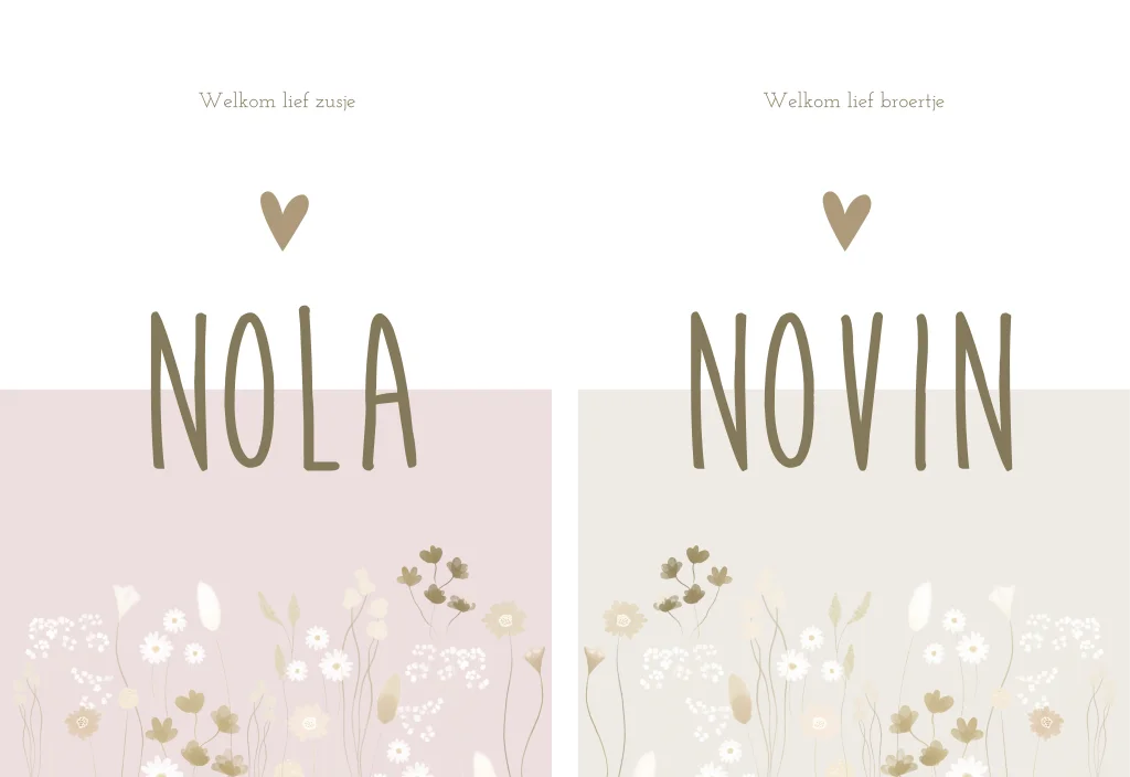 Lieve geboortekaartjes met een getekend bloemenveld met droogbloemen. Voor het meisjeskaartje is de achtergrond lichtroze en voor de jongenskaart beige. Kaartje Nola en Novin is een set. Zo heeft ieder kindje haar/zijn eigen kaartje. Maar als je de kaartjes naast elkaar legt, zijn ze weer samen één geheel.