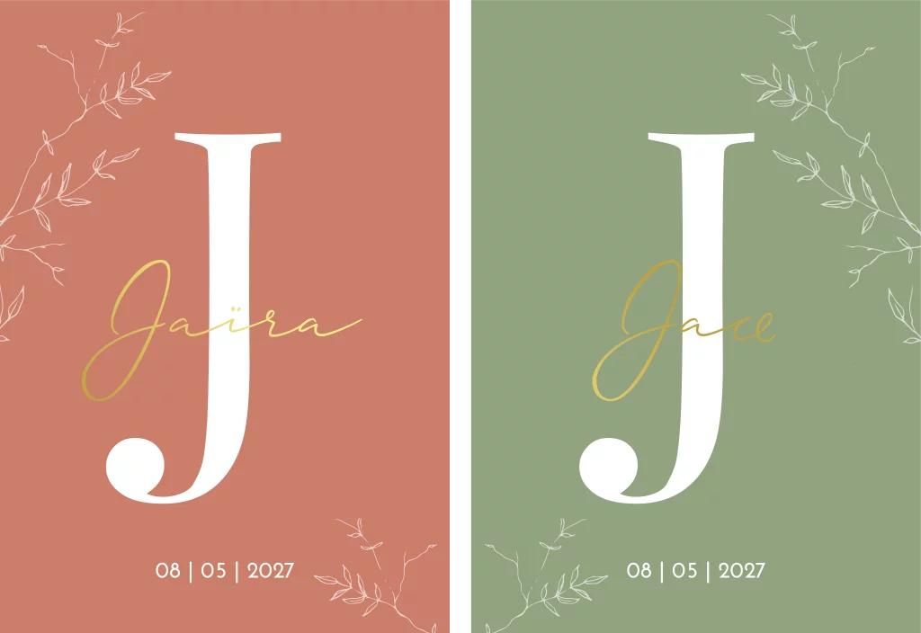 Romantische geboortekaartjes met een lijntekening van takjes en een groot initiaal op de voorzijde. Over de letter staat de naam in goudfolie met een sierlijk lettertype. Voor het meisjeskaartje is de achtergrond peach en voor de jongenskaart eucalyptus groen. Kaartje Jaïra en Jace is een set. Zo heeft ieder kindje haar/zijn eigen kaartje. Maar als je de kaartjes naast elkaar legt, zijn ze weer samen één geheel.