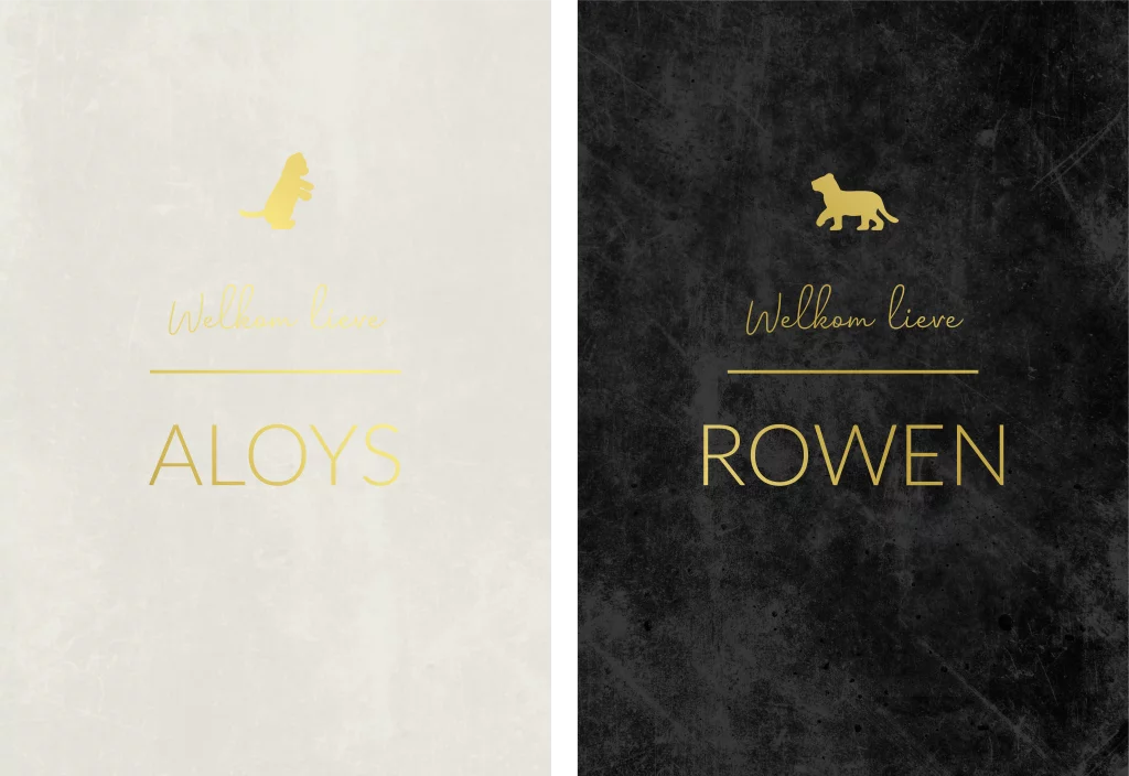 Stoere geboortekaartjes met twee spelende leeuwtjes. De kleur voor het meisjeskaartje is lichtbeige en voor de jongenskaart zwart. Beiden hebben een velvet look. Door de combinatie tussen een strak en speels lettertype is het een bijzonder ontwerp.
