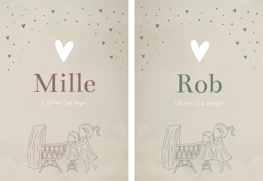 Lieve geboortekaartjes met een lijn-illustratie van twee zussen die in de wiegjes kijken. De achtergrond van de kaartjes is een beige tint en de steunkleuren voor het meisjeskaartje is oud donker roze en voor het jongenskaartje oud donkergroen. Door de hartjes worden de kaartjes extra romantisch. Kaartje Mille en Rob is een set. Zo heeft ieder kindje haar/zijn eigen kaartje. Maar als je de kaartjes naast elkaar legt, zijn ze weer samen één geheel.