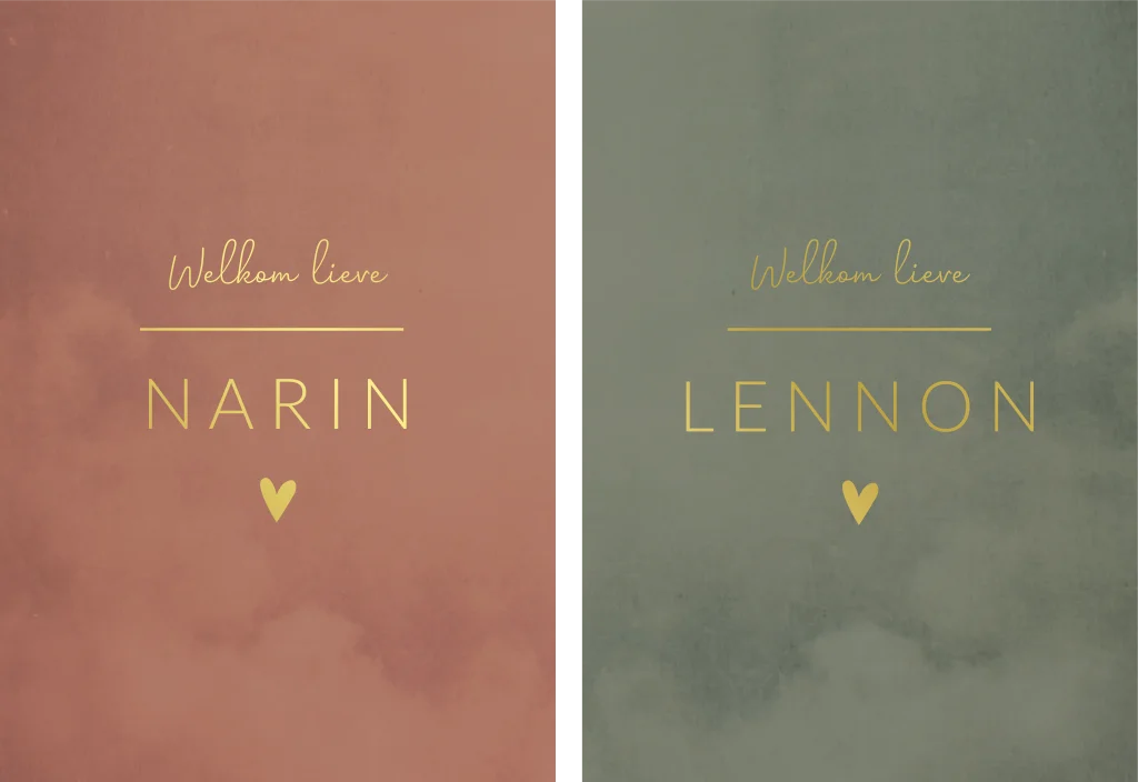 Moderne en hippe geboortekaartjes met een strak design voor de voorzijde van de kaartjes. Op de kaartjes zijn de teksten met goudfolie bedrukt om het extra luxe te maken. Kaartje Narin en Lennon is een set. Zo heeft ieder kindje haar/zijn eigen kaartje. Maar als je de kaartjes naast elkaar legt, zijn ze weer samen één geheel.