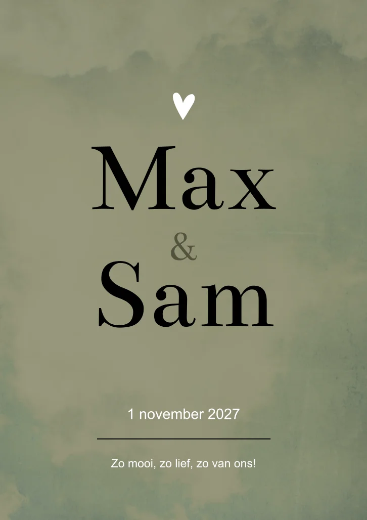 Een stoer geboortekaartje voor een tweeling met groene kleuren. Toch liever een andere kleur? Geboortekaartje Max en Sam is gemakkelijk aan te passen in de editor.