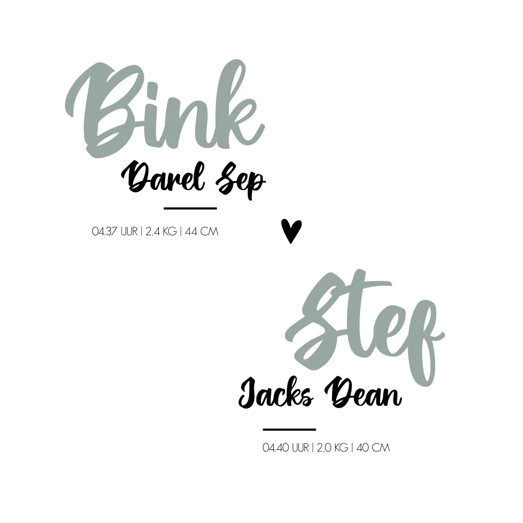 Een neutraal geboortekaartje met zwarte hartjes. Geboortekaartje Bink en Stef is een stoer kaartje voor een tweeling! Bekijk de verschillende opties in de editor. Kom je er niet uit? Neem dan gerust contact met ons op!