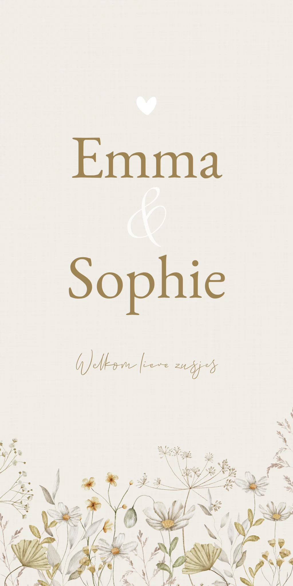 Een romantisch geboortekaartje met een waterverf/aquarel illustratie van verschillende veldbloemen. Op de achtergrond zit een heel licht linnen effect. Tweelingkaartje Emma & Sophie heeft een rustige uitstraling door het gebruik van één kleurenfamilie en wordt door het gebruik van klassieke lettertypes een tijdloos ontwerp. Wil je graag iets aanpassen? Neem dan een kijkje in de editor voor de vele opties!