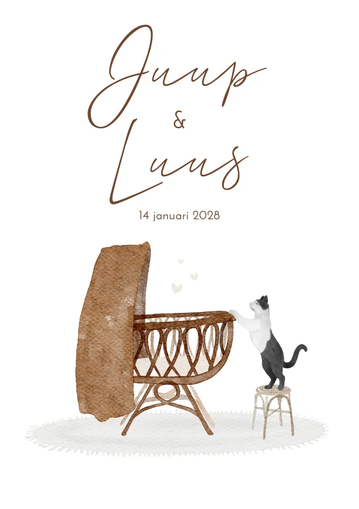 Een schattig geboortekaartje voor een tweeling Juup & Luus, geïllustreerd in watercolor stijl. Op het kaartje staat een poes die op een krukje staat en in het wiegje kijkt. Ziet jouw kat er anders uit? In onze beeldbank vind je diverse katten. Staat jouw dierenvriendje er niet tussen? Informeer naar de mogelijkheden voor een illustratie op maat!