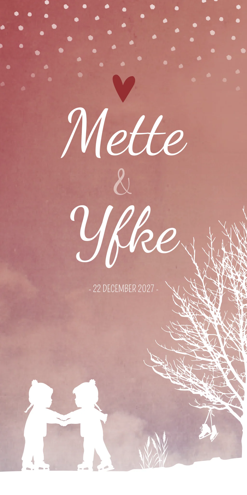 Een winters roze geboortekaartje met een illustratie van twee schaatsende zusjes. Kaartje Mette en Yfke is een perfect kaartje voor de Friezen/schaatsliefhebbers onder ons!